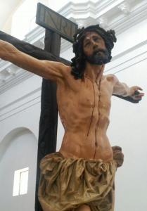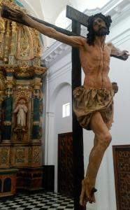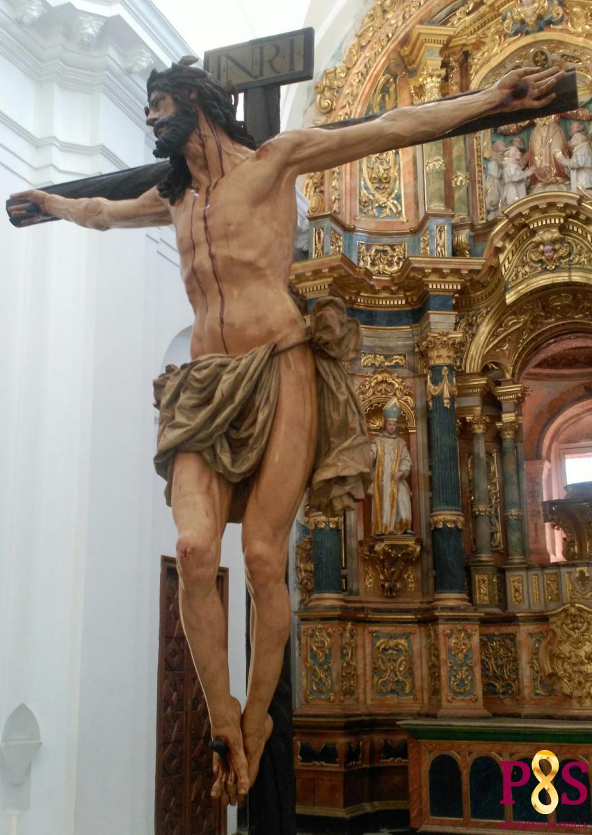 En el contrato se recoge que Jesús debería estar vivo, clavado en la cruz y coronado de espinas, siendo su tamaño más grande de lo habitual (La talla es de 2,18). El precio se estableció en 1300 reales. La madera utilizada es de cedro “en blanco” ya que por aquella época la policromía, era labor propia de los pintores supervisados por los escultores.